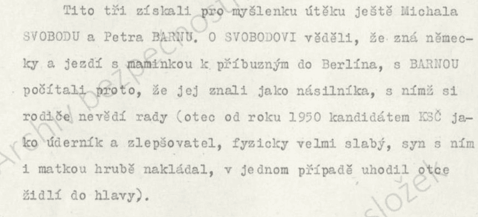 Pak donutí posádku otočit stroj na západ, což se bude posádce určitě chtít, jen čeká na to, až ji někdo přepadne. Jakkoli to zní celé přitažené za vlasy, hoši pak už dlouho neváhali. Pro věc získali ještě sedmáka Svobodu, co uměl německy, jezdil s matkou do Berlína a celkově se tvářil, že nemá s únosem letadla problém. Hlavní hvězdou teroristů byl ale vyvolen poslední oslovený – 17letý nedouk, dělník Petr Barna – vyhlášený to násilník, co mlátí rodiče a vypadá dospěle.