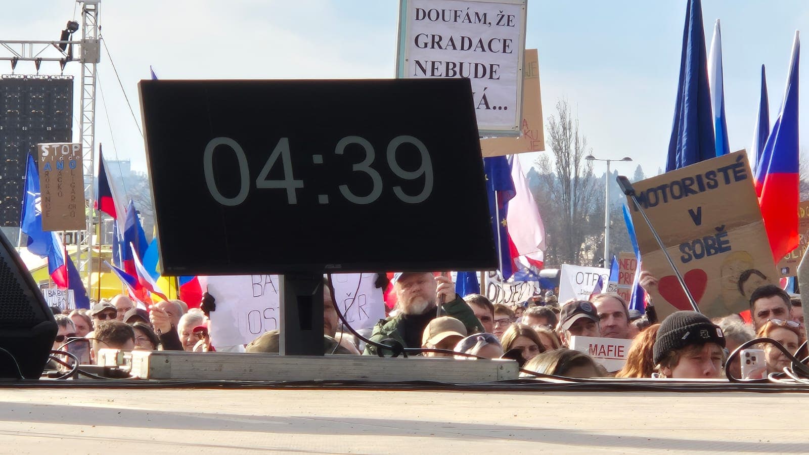 Autor textu je požitkář, a tak trávil poslední třetinu programu na balkonu protějšího domu, kde mají přátelé byt, čuměli na demošku, měli tam hodně jídla a autor si mohl fotit demošku „ze vzduchu“. I tak si pořád kontroloval ten boďák. Zajímalo ho, o kolik to „přeteče“. Jedenáct minut. Má to být půl hodiny, i kdyby tam odpočítávali místo monitorů po zuby ozbrojení nacisté a za překročení hned popravovali.