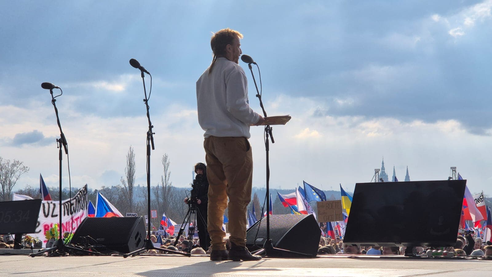 Po zákulisí pro změnu pobíhal zmíněný Robin Suchánek. Oni tihle hlavní pořadatelé vždycky pobíhají ve smrti eventem. Na Suchánkovi bylo zajímavé, že nepobíhal ve smrti, stejně jako jeho tým. Moc to nedávalo smysl. Při tomhle nejde nepobíhat ve smrti, když jste za to odpovědný. Ne za budoucnost našich dětí a apel na občanskou iniciativu! Za bezpečnost těch návštěvníků. Je jich hodně a je fuk, jestli jich je sto nebo čtyři sta tisíc.
