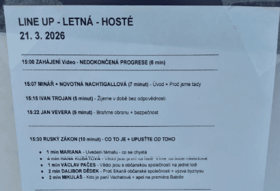 Je ostudné, že taková pěkná, celospolečensky důležitá, fajn akce, (navíc uprostřed „sedmičky“, aneb zóny „Letenské party“, prostě všude tam kavárny, intelektuálové, kdo je z Prahy, ten ví, že Letnou obývají jen děsně správný, nóbl lidi, co sedí v těch lepších kavárnách a dělají svět prostřednictvím Mirka Dušína Čižinského lepším) se odehrává v těsné blízkosti stadionu Sparty Praha. Ale aby ho alespoň na ty dvě hodiny Suchánek nějak odstínil, to už bych chtěl moc.